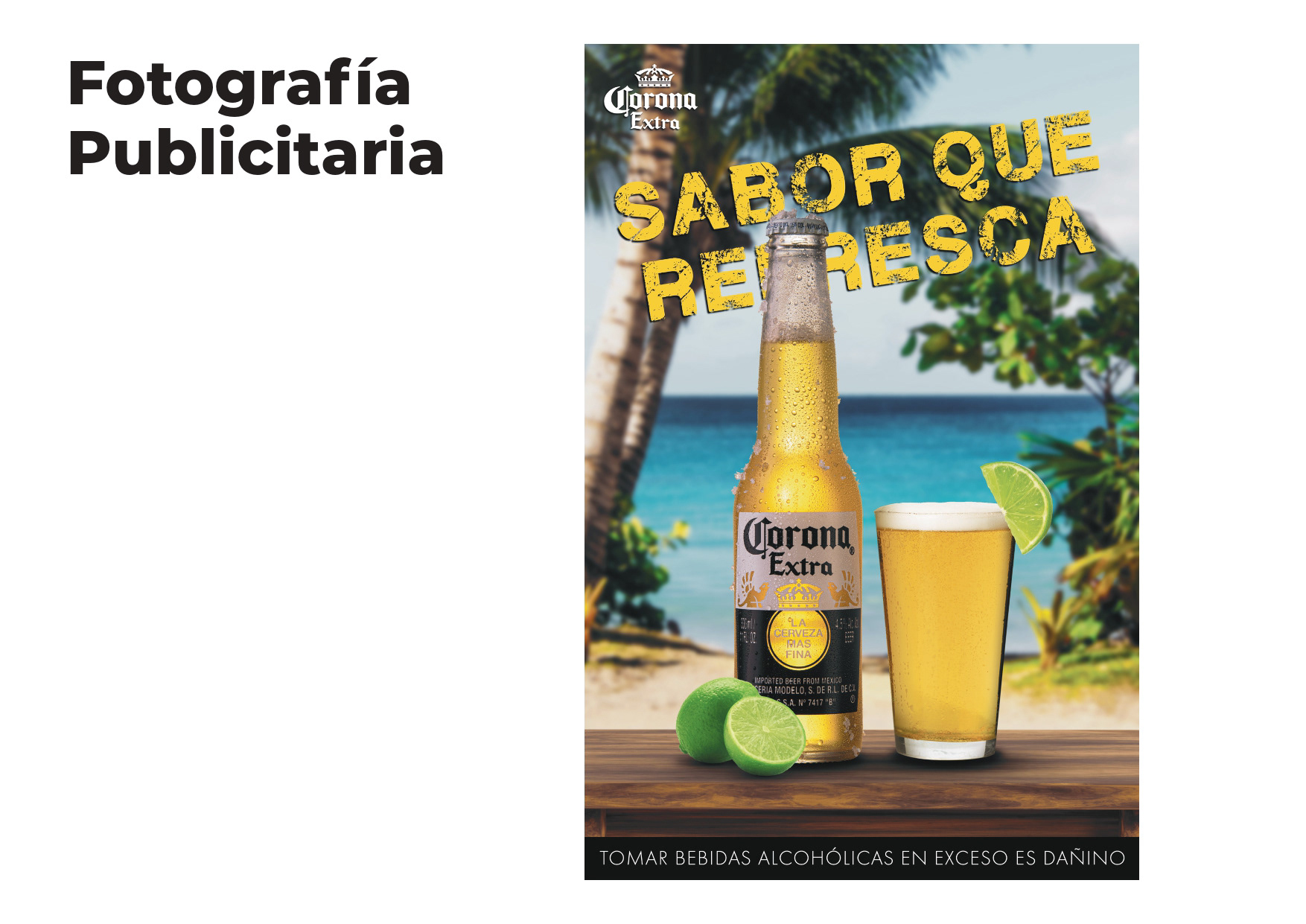El objetivo de este proyecto fue destacar los detalles de la cerveza Corona, tanto como para fotografía e-commerce, como para un arte final publicitario. En primer lugar se procedió a realizar la colorización en Lightroom, posteriormente el calado y el ajuste de algunos detalles de iluminación en Photoshop. Finalmente se realizó el montaje y transferencia a mockup.